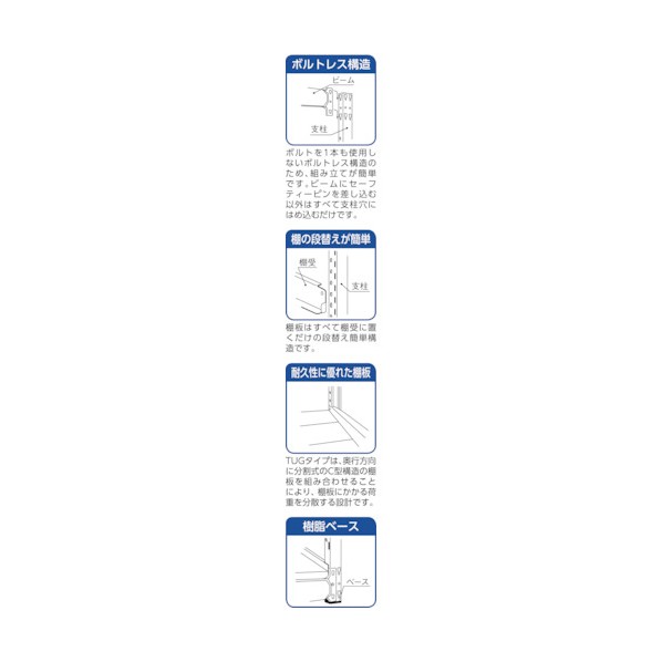 ■特徴 完全ボルトレス構造のため、工具なしで組み替え・段替えが自在にできます。 棚板は割棚方式のため、組み立て・取り扱いが容易です。 棚の段変更が、小刻みな30mmピッチで自由に調整変更ができます。 高さ、奥行が同じであれば、連結することができます。また、支柱を兼用することにより、コストダウンが図れます。 VOC(揮発性有機化合物)対応塗装です。 低ホルムアルデヒド(F☆☆☆☆)です。