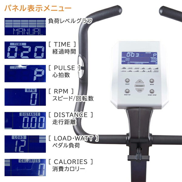 --------------------------------------------------------- 商品の説明 ・サドル高さ:12段階(約30cm) ・前後スライド:無段階(約7cm) ・32段階の自動負荷方式 ・自動負荷変化プログラム:12パターン ・簡易体脂肪計、簡易運動回復測定機能付 ・移動に便利なキャスター付 ・ハンドルグリップ式の心拍計測機能付 商品の仕様