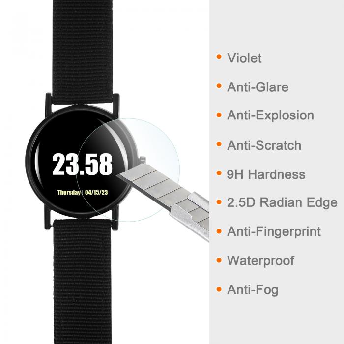 【属性1】サイズ - ガラスの画面サイズ: 36 mm; 厚さ: 0.33 mm; バイオレット、アンチグレア、アンチスクラッチ、硬度9H、2.5Dラジアンエッジ。対応ブランド: ユニバーサル; 形状: ラウンド; カラー: クリア。29 mmから46 mmの円形スクリーンプロテクターが利用可能です。