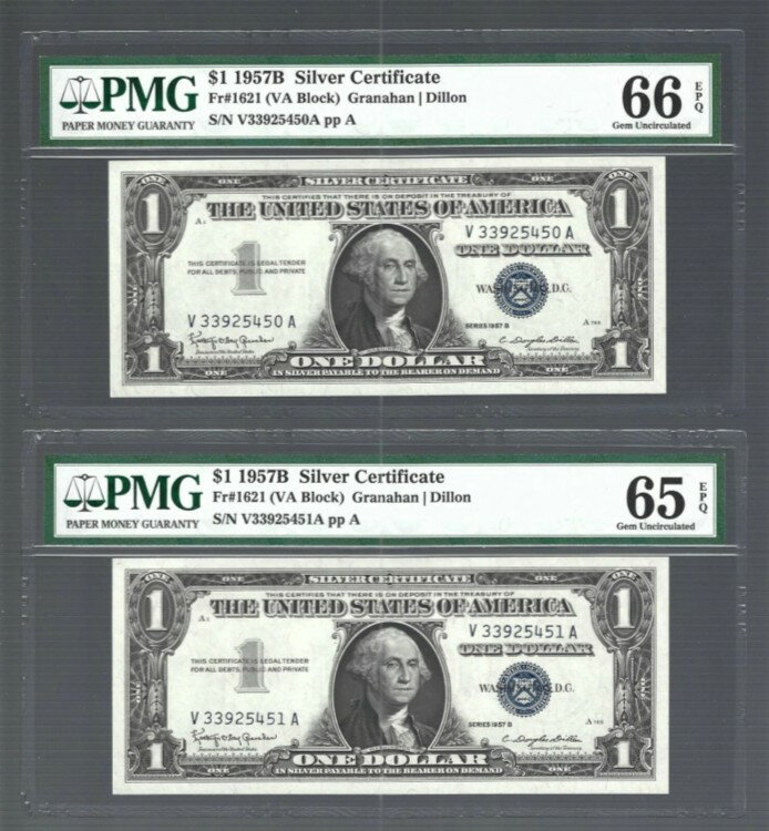 米国銀券 1957B ? $1 x 2 稼働中 S/N ? PMG 65 & 66 EPQ GEM UNC!