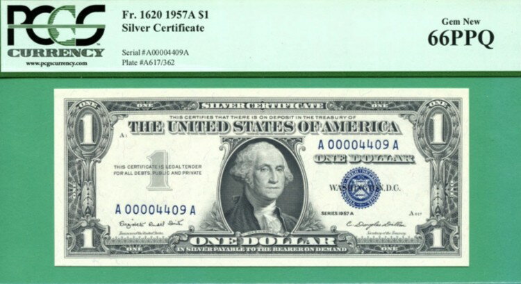 低シリアル - A 00004409 A - 1957A $1 SC - PCGS GEM 66 PPQ - Fr 1620 - 1957 A