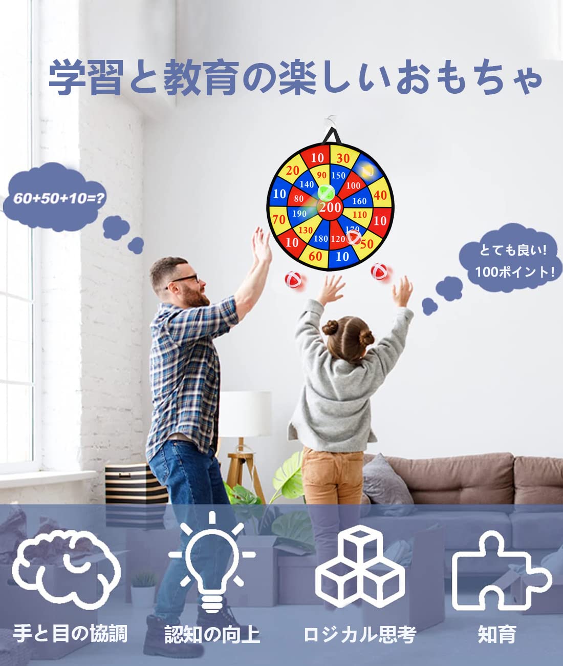 【安全・ダーツボード】ダーツボードの直径は66cmです。高品質で柔らかい生地でできたこのダーツボードセットは、丈夫で粘着力が強く、手を傷つけません。伝統的なダーツの代わりに、球体の粘着ボールは6個につけてます。尖る物ではないため、キッズ、赤ちゃんにたいしても完全平気です。