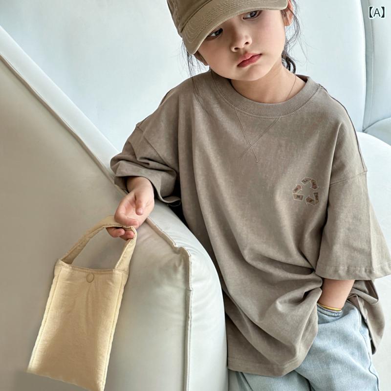 Tシャツ 女の子 ジュニア キッズ 半袖 トップス 綿 コットン 柔らかい肌触り ゆったり ビッグシルエット カジュアル 韓国風 春夏 普段使い 通学 英字ロゴ かわいい カーキ クルーネック