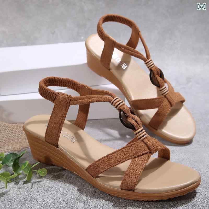 サンダル レディース 女性用 オープントゥ ウェッジソール 厚底ヒール ビーズ飾り ボヘミアン 韓国風 ビーチ リゾート 旅行 タウンユース カジュアル 布地アッパー ブラウン 茶系 ラバーソール イージーウェア 夏