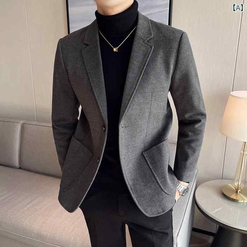 ブレザー メンズ 秋冬 厚手 ウール混紡 シワになりにくい ビジネスカジュアル きれいめ スリムフィット テーラード シングル2つボタン 長袖 無地 センターベント パッチポケット グレー ブラック ブラウン