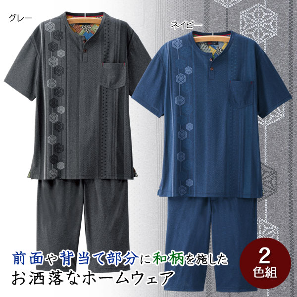 <上着・サイズ表> 単位cm サイズ 胸囲(適応サイズ) 身丈 肩幅 袖丈 S 98(80〜88) 68.5 44 21 M 104(88〜96) 70.5 46 22 L 110(96〜104) 72.5 48 23 LL 116(104〜112) 74.5 50 24 <パンツ・サイズ表> 単位cm サイズ 胴囲(適応サイズ) 総丈 股下 裾幅 S 72(68〜76) 54 24 28 M 76(76〜84) 57 26 29 L 80(84〜94) 60 28 30 LL 84(94〜104) 63 30 31 製品仕様 着用シーズン目安 春夏秋 カラー グレー・ネイビーの同サイズ2色組 ※商品によって柄の出方が異なる場合があります。 素材 ポリエステル100% 仕様 上着/左胸ポケット付 パンツ/ウエスト総ゴム、両脇・右後ろポケット付、前ファスナー付 洗濯 洗濯機可 生産国 中国前面や背当て部分に和柄を施したお洒落なホームウエア さらっと快適!和柄プリントホームウエア 2色組 日本の夏にぴったり!粋な和柄のリラックスウエア 吸汗速乾&接触冷感素材でさらっと快適!半袖シャツ&6分丈パンツのホームウエア。前面や背当て部分に和柄を施しお洒落感を演出します。ウエスト総ゴム仕様ではき心地も楽々。洗い替えに重宝するグレーとネイビーの2色セットです。 着用イメージ カラーバリエーション・セット内容
