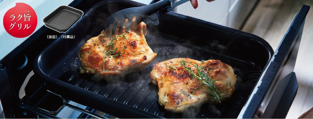 ■セールスポイントビルトインタイプのIHクッキングヒーター(3口・幅75cm)「ラク旨グリル&オーブン」を搭載し、シーズヒーターの直火とプレート加熱で素早く焼き上げる