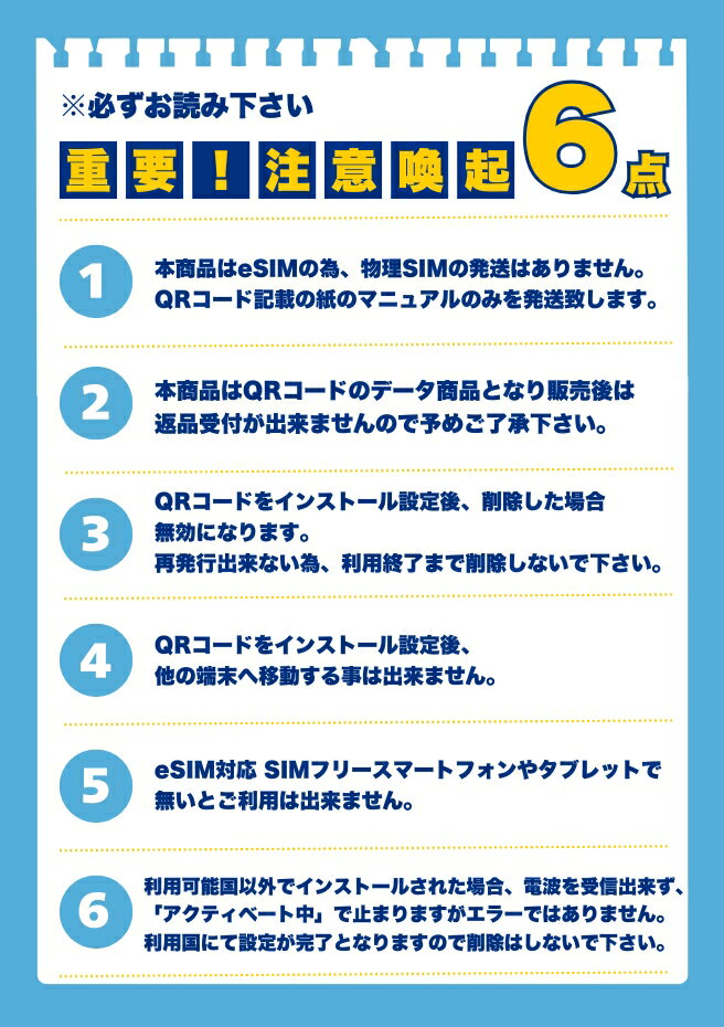 ■eSIMの為、物理SIMカードの発送はありません。QRコード付きのマニュアルPDFをメール送信しております。 ※eSIMはデータ商品の為、返品受付は出来ません。 ------