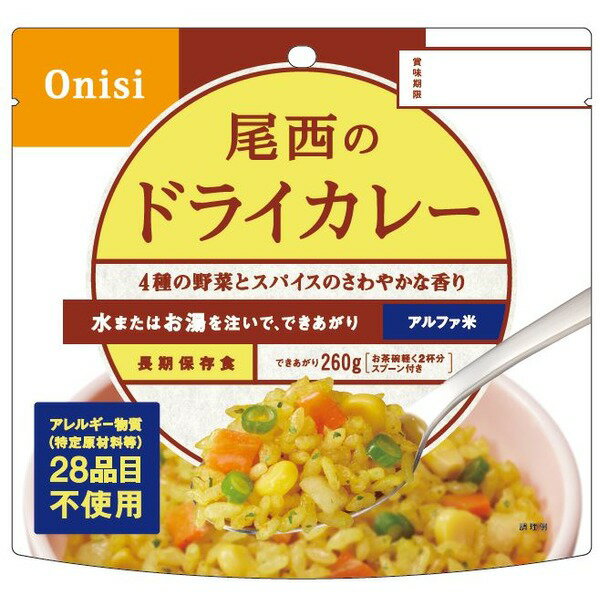 ■商品内容「尾西のドライカレー」は水または湯を注いで混ぜるだけで出来上がるお手軽ごはんです。水で60分、お湯で15分で完成します。ターメリックやクミン等、十数種類の香辛料を加えたドライカレーです。刺激的な辛さにせず、お子様にも美味しくお召し上がりいただける旨味重視の味付けです。スプーン付きだから、何処ででもお召し上がりいただけます。アウトドアや旅行、非常食にご利用下さい。でき上がりの量は、お茶碗軽く2杯分、260g!50〜55人規模の企業、団体に最適な3日分のセットです。