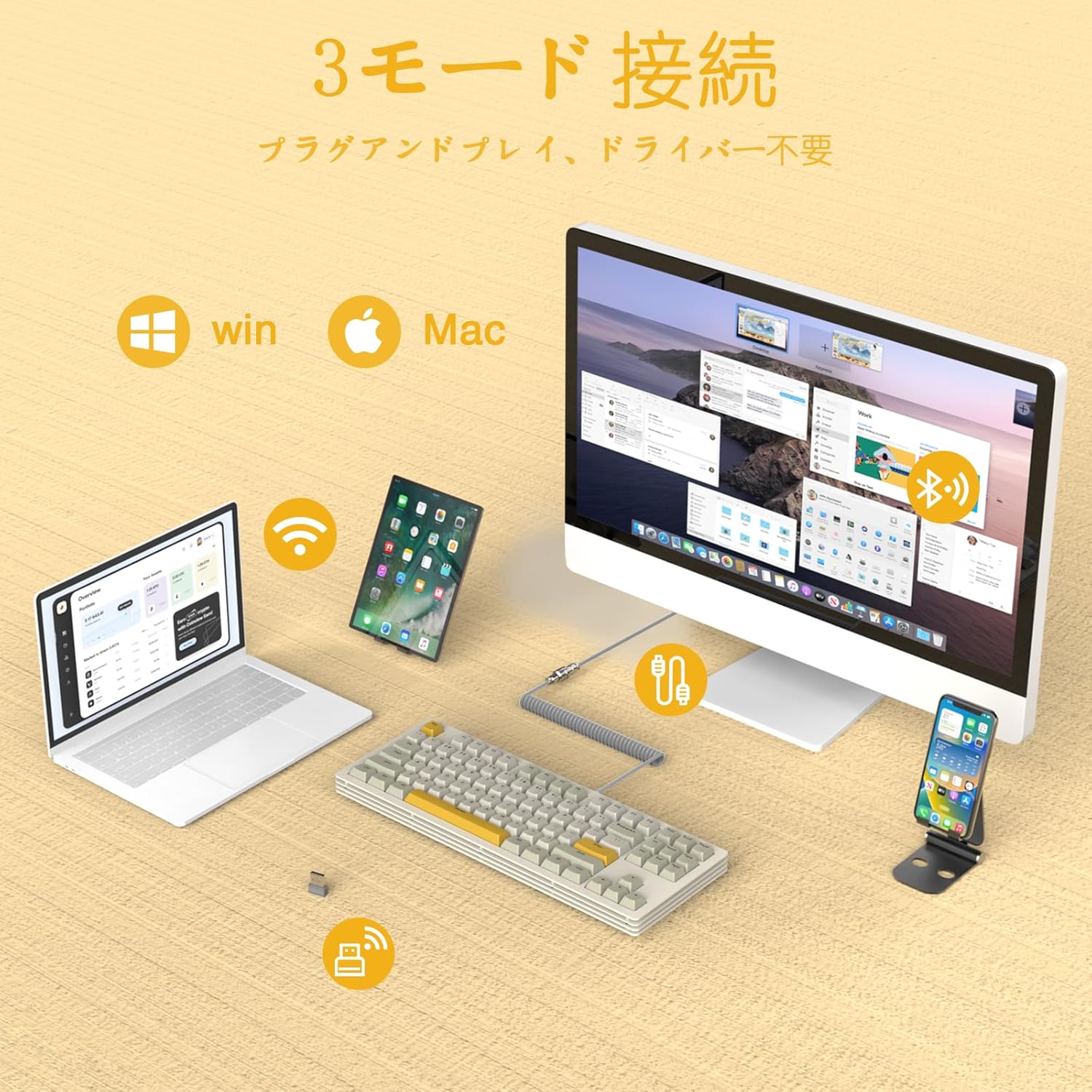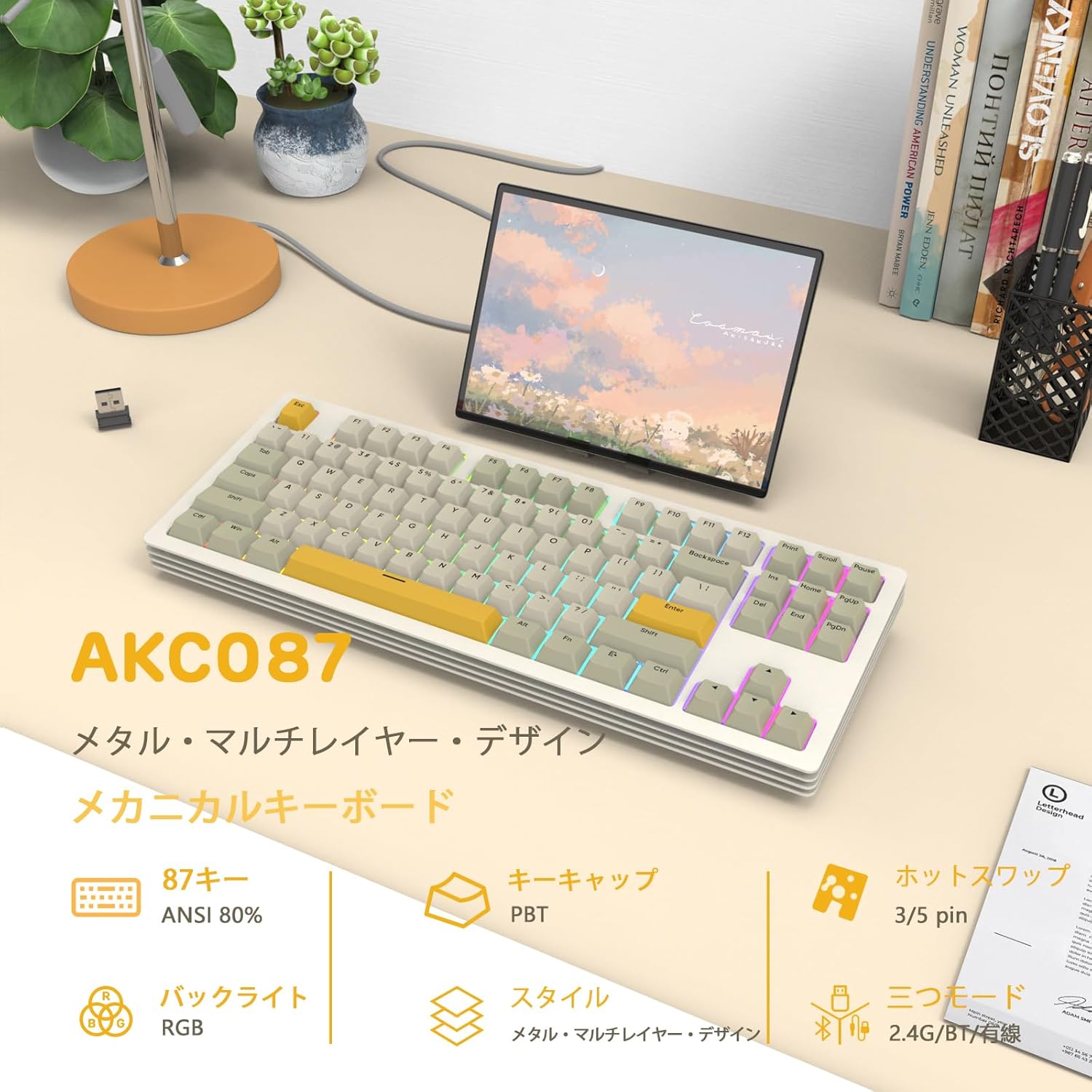 √ 金属スタッキング構造:ミルフィーユメカニカルキーボードは金属スタッキング構造を採用します。重量は約2kgと、非常に重量感があります。キーボード表面には、静電粉体塗装処理を施しています。均一なマットマナーを持っています。全体的な外観は、鮮明なミルフィーユのようなものです。手触りもサラサラしていて高級感よりもカジュアルな外観です。ノックオンすると、空気がいっぱいです、それは驚くべきことです。 √ 3モード接続キーボード:ミルフィーユゲーミングキーボードはBluetooth 5.0、2.4G、Type-C有線接続を搭載しています。さまざまな機器とさまざまなシナリオを使用して、自由に切り替えて世話をすることができます。有線モードでは最大3台の機器を接続でき、PC、スマートフォン、iPad、ノートPCなど、幅広い機器に対応します。2000mAhのバッテリー容量を持ち、長時間使用して安定させることができます。 √ 快音の軸体:新型AS101黄軸を採用したミルフィーユメカニカルキーボード、クラスHPアドバンス段落軸、滑らかな感触と鮮明な音、オープンスタック構造で使用、打鍵時に鮮明な音を聞くことができ、非常に癒されます。すべてのキーがホットスワップ対応なので、自由に交換し、自分だけの「シャキシャキ感」を演出することができます。潤滑式リニアスイッチ、操作力45g、アクションストローク2mm、叩くとまっすぐ上下に動く、滑らかな感触。 √ カラフルなRGBバックライト:サウザンドレイヤーのクリスプメカニカルキーボードには、18の異なるバックライト効果があります。 自由に切り替えることができます。 RGBバックライトは、ゲームをプレイする際にとてもクールな要素で、「FN+|」キーで18種類のバックライトモードを素早く切り替えることができます。ドライバーの定義の色の組み合わせをサポートすると、自由に体験を増やし、部屋全体に異なる色を追加できます。 √ TKLホットスワップ対応キーボード:フルサイズレイアウトとは異なり、87キーメカニカルキーボードはマウスのためにデスクトップスペースをより多く節約できます。 また、キーボードは3/5ピン経由でホットスワップでき、市場にあるほとんどのGateron、Cherry、Kailhおよびその他のスイッチに対応しています。ユニークなタイピング体験を求める方向けに設計されているので、タイピングとゲームに最適です。 すべてのキーがホットスワップ対応なので、お好みでキーを交換し、自分だけの「サクサク感」を演出することができます。 √ 親切な細部設計:カスタムキーボードにマグネット式取り外しカバー、キーボードを取り外して掃除するのがもっと便利です。 ホットスワップ対応メカニカルキーボードの底面に2.4G暗号化隠しデザイン、紛失の心配はありません;調整可能な足は、長時間のタイピング/ゲームに快適な角度を提供します。 タイピスト、プログラマー、ゲーマーに最適な製品です。