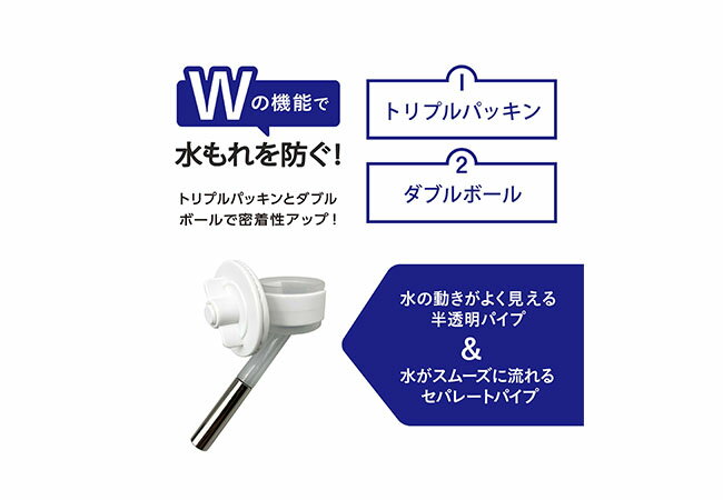 ピタポタノズル Wの機能で水もれを防ぐ!・Wの機能で水もれを防ぐ!トリプルパッキンとダブルボールで密着性アップ! ・水がスムーズに流れる、水と空気の通り道を分けたセパレートパイプ