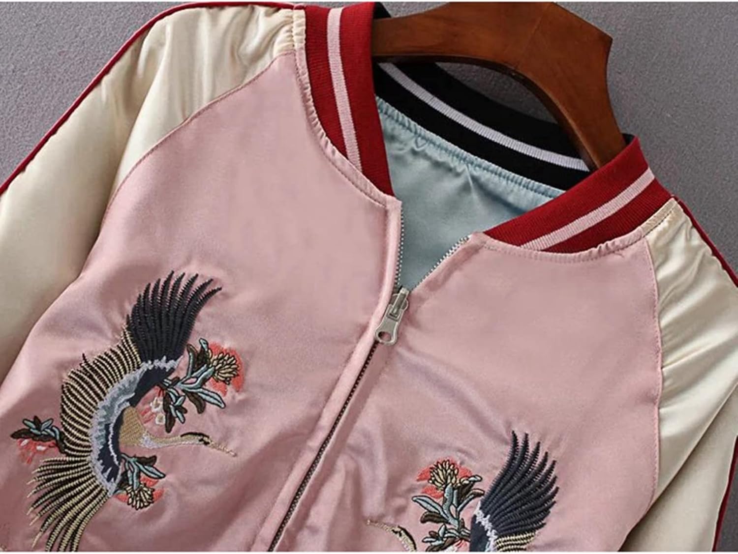【普段のサイズより1〜2サイズ上の方がおすすめです。必ずご確認後、ご了承頂いた上でご購入をお願いいたします。】肌触りが柔らかい高品質な素材で作られたジャケットは、上質な裏地もあって、通気性が良く、しわになりにくいです。高級感を醸し出すと同時に、快適な着心地を実現できます。 両面に着用できる春秋用レディースリバーシブルスカジャンです。ピンクとブルーのリバーシブルなので、その日の気分に合わせて、コーディネートを楽しんで頂けます。見た目にもカッコイイ、高級感があります。秋 冬 春シーズンには欠かせないアイテムです。 襟、袖口とウエストのリブ編み部分は柔らかい弾力とストレッチ性があり、窮屈すぎることなく快適な着心地です。 重ね着もしやすいので、ごわつかず快適にお過ごしいただけます。 パーカーやトレーナー、ニットなどの上に羽織れて、春、秋、冬とロングシーズン活躍すること間違いなし。 在宅時にも室内着やパジャマの上にサッと着れば、突然の来客やちょっとした用事にはすぐに対応できるので便利ですよ。