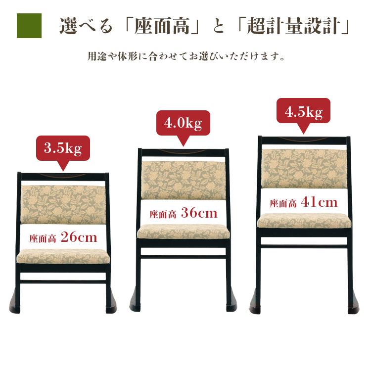 品 名 高座椅子 6型 生 産 地 タイ サイズ(約) 座面高26cm:W47.5 × D52 × H60cm 座面高36cm:W48× D53 × H70cm 座面高41cm:W48.5 × D54 × H75cm 材 質 木部:植林材 張地:PVC(合皮) 塗装:ウレタン カラー 木部:ブラック 張地:平織調 特 徴 畳にやさしい和室用んほ超軽量チェアです。 スタッキング機能付きで収納にも便利。 座面の高さを3種類ご用意しました。 お寺や神社などの落ち着いた雰囲気にピッタリの高座椅子です。 商品は完成品となっております。 備 考 メーカー品のため他の商品との同梱ができません。 北海道・東北・沖縄・離島への配送は追加送料を頂戴いたします。ご了承ください。 ※お使いのモニターによって 発色が異なるため、表示されている色と実際の色とは異なる場合があります。※お使いのモニターによって 発色が異なるため、表示されている色と実際の色とは異なる場合があります。