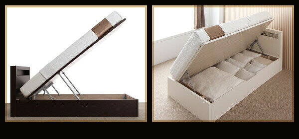 ■商品についてセミダブルベッド 茶色 ダークブラウン 茶 こげ茶、白 ホワイト、ナチュラルから選べる お客様組立 開閉タイプが選べる跳ね上げ収納ベッド マルチラススーパースプリングマットレス付き 横開き 深さラージ 宝箱の上は、夢心地。LIFTUP BED GRAND-L BIG STORAGE・・・大容量収納!COMFORTABLE MATTRESS・・・寝心地の良いマットレスベッド下は秘密の宝箱。見た目は普通のベッドですが、床下は一面、収納庫。たっぷり入るので、大型のものも長いものもOK。外からはわからないので、秘密の宝物もたっぷり収納できます。開閉を自由に。マットレス、枕やかけ布団はそのまま載せたまま、開けることができます。ガス圧ダンパーの力で、女性でも、軽い力で。開閉ラクラク。思いついた時に、さっと開閉できます。大きく上に跳ねあがるので、荷物を一覧できます。お部屋のレイアウトに合わせて、用途に合わせて。開閉方向は縦と、横と、お選び頂けます。床板部分がスライドして開閉する方式です。縦型はヘッドボードにマットレスがあたりません。横型はマットレスが壁にぶつからないので、壁側にもくっつけて設置できます。横開きは組み立ての際に好きな方につける事が可能です。右開きも、左開きも、部屋のレイアウトに合わせてご自由に。極上の寝心地を。やはり寝心地は妥協したく無い。人生の中で長い時間を過ごすベッドは、上質なものを。眠りの質にもこだわりたい。選べるマットレスボンネルコイルマットレスポケットコイルマットレス 3種類フランスベッド社製マットレス 3種類ホテルでも多く使用されているフランスベッド社製マットレスもご用意しております。シンプルな美しさ。見た目は美しく、シンプルで。それでいて機能面も充実した、デザインにしました。2台並べても美しいデザイン。セミシングルサイズを2台並べるとクイーンサイズに。お好みのデザインを。レギュラータイプすっきりとした佇まいで、お部屋の圧迫感を感じさせません。見た目は収納ベッドだとわからないので、デザイン重視の方はこちらをどうぞ。お子様がいるご家庭にも、低めが人気です。ラージタイプたっぷりの大容量で、床下の収納量は抜群。とにかく収納重視!の方はこちらをどうぞ。床板高さが高くなるので、薄型マットレスとの組み合わせがおすすめです。信頼の日本製やはり、信頼できるのは日本生産。作りの頑丈さや、細部までのこだわりは、日本人ならではの感性です。見えない収納部分までも、しっかりとつくりこんであります。ガス圧ダンパー部分も信頼の日本製で安心です。細部までのこだわり。2口コンセント付です。背面も美しく、化粧仕上げです。ダンパー部分はカバーがついているので荷物にあたる事はありません。底板もしっかりとあるので、荷物を埃から守ります。収納部も化粧板仕上げです。カラーダークブラウンナチュラルホワイト 衣服やシーツカバーなどの整理、収納は勿論、衣装ケースも収納できる。跳ね上げタイプだから 引出しのためのスペースが無い時などに最適。 1人でゆったり余裕の広さが嬉しい。