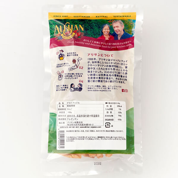 ※こちらの商品は、法人様および個人事業主様専用の商品となります。商品購入の際、法人名あるいは屋号(店舗名)を必ずご記載ください。また、仕入れ元より直送となりますためご注文のキャンセル、返品はできませんのでご注意ください。 アリサン ドライアップル は、アリゾナ州で生産されたオーガニックのリンゴです。 柔らかくふわふわした食感で、おやつやおつまみ以外にも、ケーキやマフィン作りにお役立てください。 <OTCO 認定とは> Oregon Tilth Certified Organic オーガニック認証 米国農務省が定めるオーガニックプログラム公認の認可団体「オレゴン・ティルス(OREGON TILTH)」が規定する、オーガニック認証。 オレゴン・ティルスはオーガニック食品とその農業を支持するために1974年にアメリカのオレゴン州に誕生した非営利な民間による会員組織であり、アメリカのオーガニック認定の中でも信頼性のある厳しい基準の1つとされています。 認定される為には、最低でも7年間、一切の化学肥料・駆除剤を使わずに、自然の肥料だけを使って土壌改良し、バクテリアが健全に増殖できる農地づくりが必要です。 <アリサンについて> アリサン有限会社が海外からナチュラルフードを日本に紹介し始めたのは1988年。 もともと自分達が食べるためのグラノラやピーナッツバターを輸入し始めたことが日本に住む友人たちに知れ渡り、現在の形へと発展してきました。 社名の『アリサン 』は代表のパートナー、フェイの故郷である台湾の山『阿里山』からきています。 阿里山は標高が高く、厳しい自然環境にあるのですが、大変美しいところです。 また、そこに住む人々は歴史や自然への造詣が深く、よく働き、暖かい。そして皆が助け合って暮らしています。 自分達が愛するこの強くて優しい阿里山のような場所を作りたいとの思いから社名を『アリサン 』と名付けました。 現在の取り扱い品目は約300種類。 日常的にご使用いただけるオーガニック&ベジタリアンフードを基本としています。 また、食生活の幅を広げ、より楽しめるために、日本では馴染みのない“エスニックフード”も多数あります。